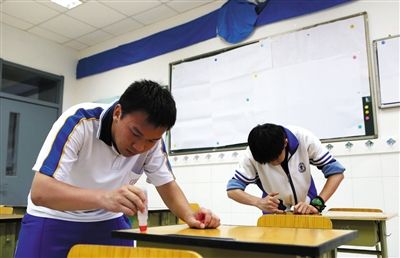 今年,北交大附中还会迎来9名特殊考生,其中2人为视力障碍、7人为听力障碍。这在考场门边贴出的考场信息介绍中已经有所显示,理工第13考场只有两名学生,“就来两个人考啊?”一名布置完考场的学生很惊讶。