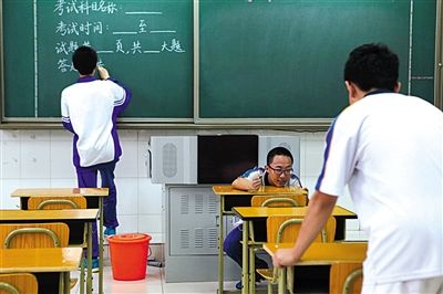 昨日下午4时许,北交大附中的放学铃刚打完,学生们就开始收拾书包,清理桌椅,打扫教室,逐步收拾考场。