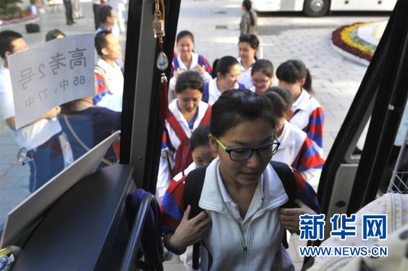 6月7日,在北京市北京宏志中学,即将参加高考的学生乘车赶赴考场。当日,2015年高考拉开帷幕,北京宏志中学动用4辆大客车将住校的230名考生送往各个考点。 新华社记者 高健钧 摄
