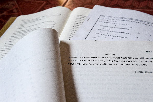 2014年8月2日,张双兵正在展示日本高院驳回中国“慰安妇”诉讼请求的终审判决书