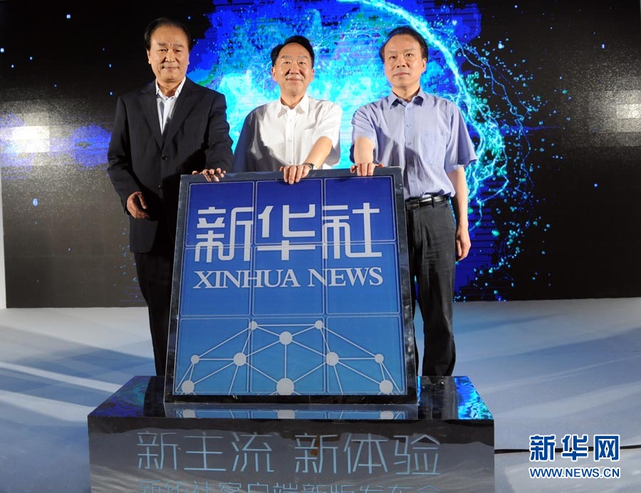 6月8日上午10:00,新华社客户端新版发布会在总社大厦多功能厅举行。图为中宣部副部长、国务院新闻办公室主任蒋建国(中)、新华社社长蔡名照(左)、新华社总编辑何平(右)共同发布“新华社”客户端新版。新华网 陈竞超 摄