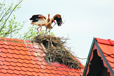 穿过密林,进入这个位于萨瓦河右岸的小村子,马上能感受到两个“王国”的和谐共存。一个是白鹳的王国,这种高达一米、双翼展开长达一米半的大鸟,把巨大的鸟窝搭建在老式木屋的屋顶上,在这里生儿育女,飞进飞出,啄理羽毛,搔首弄姿,全然不受地面上另一个人类“王国”的干扰。契格奇常住村民不过80人,白鹳却有近200只,有的房顶上甚至有两三个鹳窝。克罗地亚境内三分之一的白鹳选择在萨瓦河两岸筑巢,其中白鹳数量最多的村子就是契格奇。因此,1994年欧洲自然基金会授予契格奇首个“欧洲鹳村”称号。