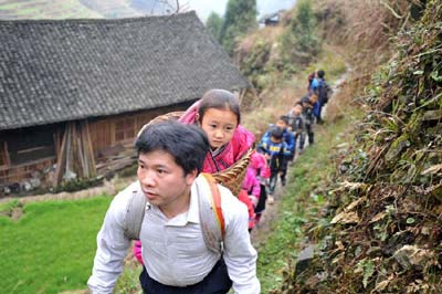 图为余启贵老师在放学路上将一名走不动的孩子背在背篓里,并领着其他孩子们一起回家(2013年2月26日摄)。广西桂林市龙胜各族自治县龙脊镇江柳村翁江教学点距当地镇政府所在地33公里,是龙脊镇最偏远的教学点,余启贵是这里唯一的老师。新华社记者 陆波岸 摄