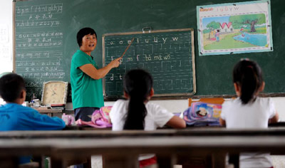 图为安徽省肥西县大丰小学的俞萍老师为学校里仅有的3名学生上课(2014年9月9日摄)。“这一届,学校只有3名学生。”对俞萍来说,这是她从教30年来面对的最少一届学生。新华社记者 刘军喜 摄