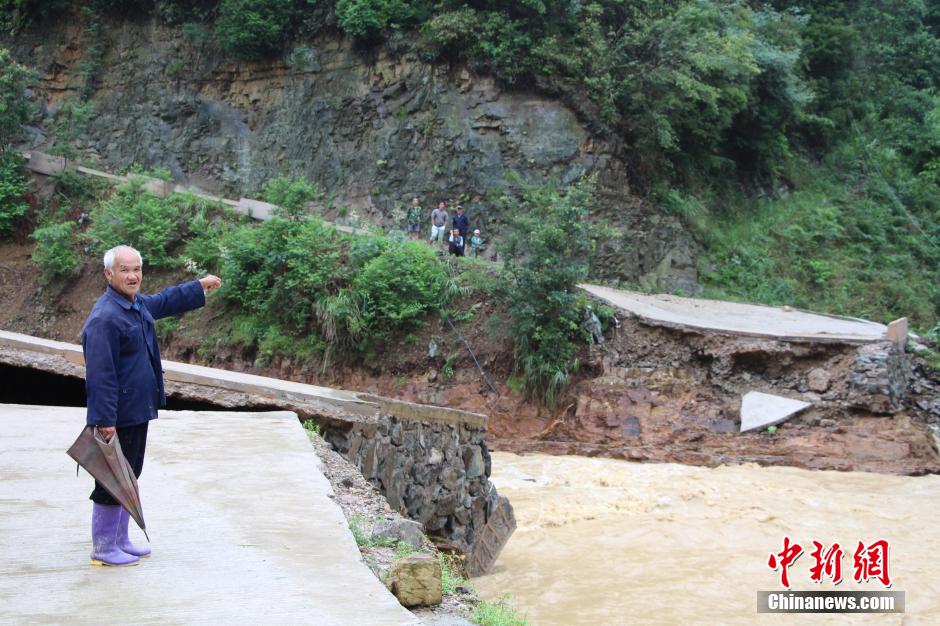 6月7日晚20时至8日11时雷山县持续降雨,5.27特大洪灾灾后重建中的雷山县再次遭受洪水肆虐,望丰乡乌江村的最高降雨量为303.5mm。 图为排敢览自然寨85岁的吴道新老人说,他第一次看到能冲断水泥桥的洪水。 中新社发 李应光 摄
