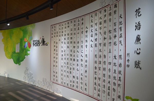 温江区“花语廉心”廉洁文化教育基地的《花语廉心赋》以花寄情,以花喻廉,舒展出对于廉洁之君的敬仰和尊崇。