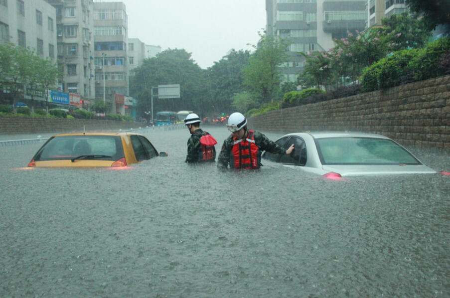 受暴雨影响,柳州市区鹅山立交桥路段,北雀路桂景湾路口等路段积水严重,车辆无法通行,消防官兵赶到现场进行救援。
