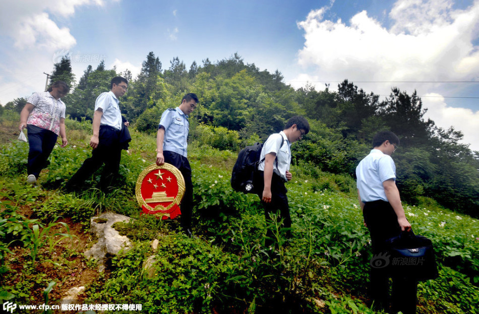 大山里交通不便,“巡回法庭”还会现场审理一些案子。图为奉节县兴隆镇清泉村,第三法庭的法官们赶往一起离婚案的庭审现场。