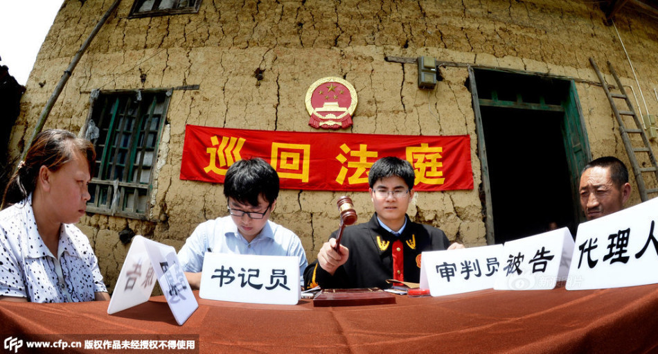 6月9日,重庆奉节县大山里的兴隆镇回龙村,奉节县法院第三法庭法官乘溜索进村普法。在河面上空,两名背着“巡回法庭”背包、捧着国徽的小伙,像一个“吊斗”,一把把用手扯着钢丝上的绳索,摇摇晃晃向河对岸50米外的村庄滑去……摄影:重庆晨报鞠芝勤 苑铁力/CFP