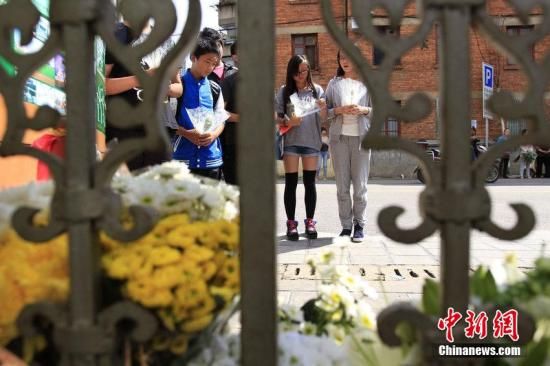 2014年9月27日,昆明,有多位市民到明通小学校门外献花、默哀,悼念逝去的生命。图为明通小学门口往届校友献花默哀。