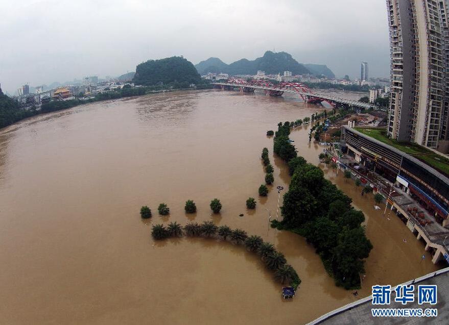 6月15日拍摄的柳州市柳江河面和被水淹的滨江东路。受连日强降雨影响,广西柳州柳江迎来洪水,6月15日7时,实时水位显示为82.24米,距离警戒水位82.5米仅差0.26米。新华社发 张存立 摄 图片来源:新华网