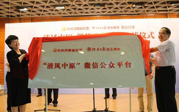 6月16日,由河南省纪委与河南日报报业集团联手打造的微信公众平台“清风中原”正式上线。河南省委常委、省纪委书记尹晋华,省委常委、宣传部长赵素萍出席上线仪式,并为“清风中原”微信公众平台揭牌。