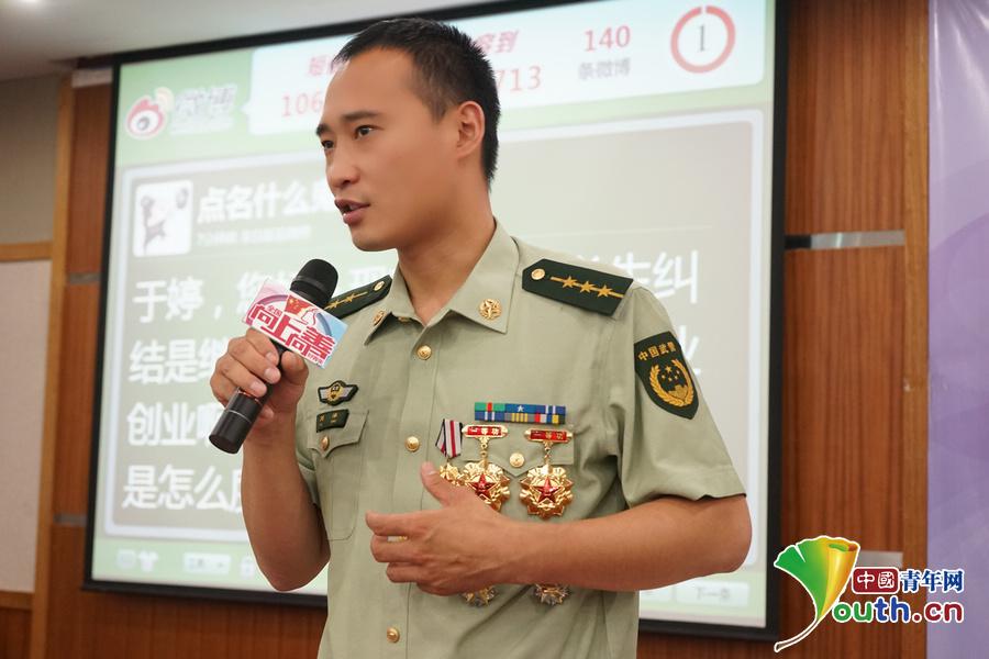 武警北京总队雪豹突击队特战二队副队长刘洋与大家分享自己的青春故事。 中国青年网记者 杨茜 摄