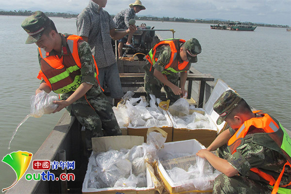 广西防城港边防官兵联合渔政部门将珊瑚放归海洋。中国青年网通讯员 黄莹摄