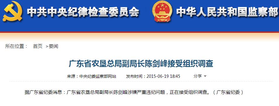 人民网北京6月19日电 中央纪委监察部网站今日晚间发布,据广东省纪委消息:广东省农垦总局副局长陈剑峰涉嫌严重违纪问题,正在接受组织调查。