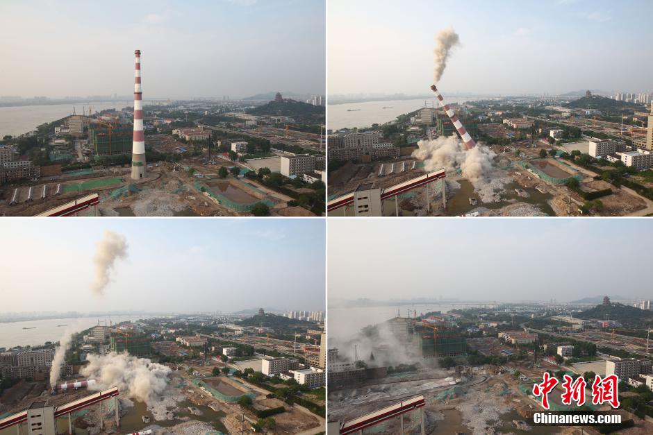 6月19日下午,位于南京中山码头旁有105年历史的民国电厂内,一座建于上个世纪九十年代的大型烟囱被爆破拆除。在轰然一声中,这座高达150米、红白相间的150米“大高个”宛如玩具一般倾斜倒下。这项引人注目的拆除“动作”,意味着,随着大部分重工业企业撤出南京主城区,城内最高的一根巨型“烟囱”也消失了。南京下关电厂作为南京地区最早的一座电厂,也是清末中国第一家官办公用电厂—金陵电灯官厂,后成为民国时期的首都电厂,始建于民国1910年,至今已有105年的历史。图为爆破连续瞬间(拼版照片)。中新社发 泱波 摄