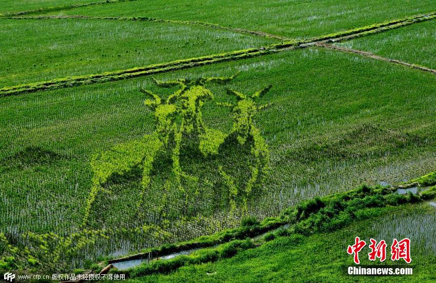 2015年6月22日,辽宁省沈阳市,总占地面积150亩的巨幅稻田画《中国日子 呱呱叫》、《中国梦 幸福起航》、《小梦露》等十三幅“3D稻田画”正式亮相沈阳沈北新区兴隆台锡伯族镇。据了解,锡伯族有种植稻田画祈福的传统,稻田画先设计好要表现的图形,利用先进的3D技术和透视技术,用矢量法定点定桩连线人工填色,种植不同品种有着不同颜色叶子的水稻,绘制出平面,立体,喽空,线条四种不同风格稻田画。图片来源:CFP