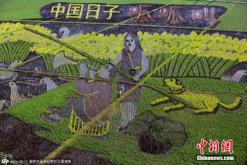 2015年6月22日,辽宁省沈阳市,总占地面积150亩的巨幅稻田画《中国日子 呱呱叫》、《中国梦 幸福起航》、《小梦露》等十三幅“3D稻田画”正式亮相沈阳沈北新区兴隆台锡伯族镇。据了解,锡伯族有种植稻田画祈福的传统,稻田画先设计好要表现的图形,利用先进的3D技术和透视技术,用矢量法定点定桩连线人工填色,种植不同品种有着不同颜色叶子的水稻,绘制出平面,立体,喽空,线条四种不同风格稻田画。图片来源:CFP