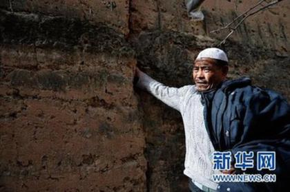 甘肃省东乡县柳树乡红庄村,村民马他非勒将手伸进已经裂缝的墙体,因为没有钱整修,一家人至今住在危房里(3月15日摄)。 新华社记者 陈斌 摄
