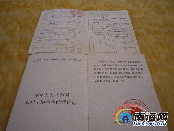 李先梅拿出两本“农村土地承包经营权证”给记者看。一本琼中农地承包权(中平)第0210031号承包证写明承包人是李先梅,她在双华岭承包的坡地有50亩,属农业用地,东至文海地,南至岳成地,西至阿强槟榔地,北至明贵地。琼中农地承包权(中平)第0210051号承包证写明承包人是韩松弟,他在双华岭承包的坡地有20亩。这两块地的承包期从1997年12月31日至2027年12月31日。这两本证都是琼中县政府于2005年9月18日颁发的,同时还盖了中平镇双慢田第二队经济合作社和琼中农业局的公章。