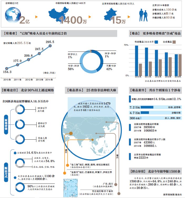 明天就是“国际禁毒日”,24日中国国家禁毒委员会副主任、公安部部长助理刘跃进和公安部禁毒局局长胡明朗在国务院新闻办公室发布《2014年中国毒品形势报告》,这是中国政府首次对外发布的毒品形势报告。当天下午,市禁毒办联合市政府新闻办召开了“北京市禁毒工作新闻发布会”介绍北京当前的毒情形势和禁毒工作。最高法、北京高院当天也发布去年毒品案件数据。根据各政府、司法机构发布数据显示,目前我国实际吸毒人员超1400万,这意味着全国100人中有1人吸毒。其中北京登记在册吸毒人员已达3万余名。毒品的滥用,以及网络成为制毒贩毒的重要平台,预计我国毒品形势在一段时期内仍处于犯罪多发期,北京毒品犯罪也仍呈现高发态势,为此去年以来,北京市法院坚持依法从严惩处毒品犯罪,先后审判了李代沫、尹相杰、陈祖名、张默等人涉毒刑事案件,有效震慑犯罪。