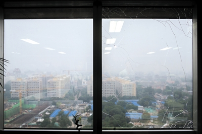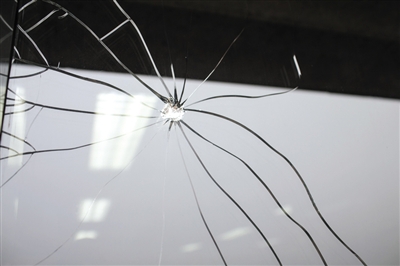 昨日,北京西城一高层写字楼窗户现疑似弹孔。
