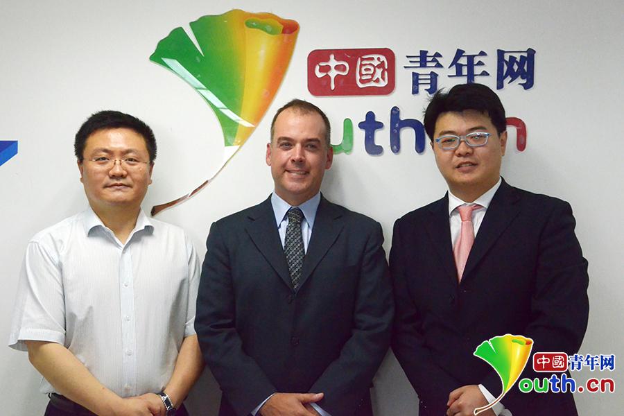 联合国千年计划办公室主任Mitchell Toomey(中)、世青创新中心首席秘书长王则开(右)与中国青年网相关负责人合影。中国青年网见习记者 崔靓 摄