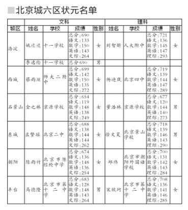 今年,北京市的高考情况也与全国大趋势相同。除了全市文理状元均是女生外,城六区的第一名也大多由女生组成。