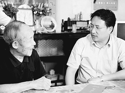 郑光泉(右)走访广丰五都镇农民党员。 资料照片