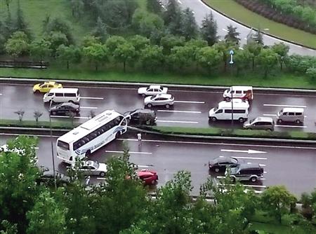 昨天上午9时50分左右,在机场路进城方向宝圣立交路段,一辆车牌号为渝BP93XX的大型客车(空车无乘客)在行驶过程中,其左侧行驶的一辆车牌号为渝BPK5XX的红色丰田轿车突然变更车道,大客车驾驶员采取紧急制动措施,但因天雨路滑,制动效果差,为避免碰撞,大客车驾驶员向左猛打方向避让,在与一辆正常行驶的猎豹牌小型轿车发生碰撞后,车辆失控发生侧移,撞上机场路中间隔离护栏。