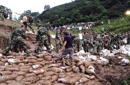 昨日,万州区万丰桥水库,武警船艇支队官兵和当地村民一起封堵决口。 通讯员 向素良 记者 邹飞 摄