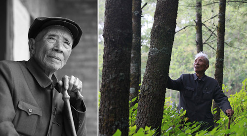 左图,杨善洲的资料照片(2009年10月摄)。右图,杨善洲在大亮山林场(2009年摄)。新华社发