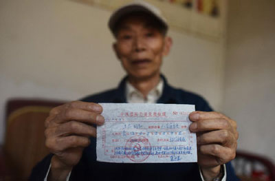 图为6月29日,89岁的老党员王忠在湖南岳阳市的家中展示他交纳的15万元“特殊党费”的收据。 新华社记者 李尕 摄