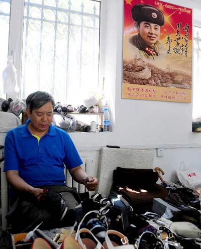 图为6月30日,农民工共产党员、鞋匠孟广彬在自己的“雷锋鞋铺”修鞋。新华社发(强勇 摄)