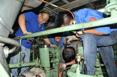 图为1月27日,49岁的共产党员、绰号“老轨”的“蛟龙”号母船“向阳红09”船轮机长刘军(左一)与同事在设备抢修现场。新华社发