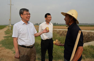 图为6月10日,河南兰考县委书记王新军(左一)与当地农民交流,了解农业生产、收成等情况。 新华社发(孙百乐 摄)