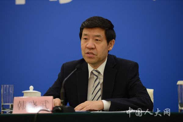 7月1日上午,十二届全国人大常委会第十五次会议闭幕后,全国人大常委会办公厅在人民大会堂台湾厅召开新闻发布会,有关方面负责人就新通过的国家安全法和全国人大常委会关于实行宪法宣誓制度的决定的有关问题回答记者提问。图为全国人大常委会副秘书长韩晓武回答记者提问。马冬潇 摄