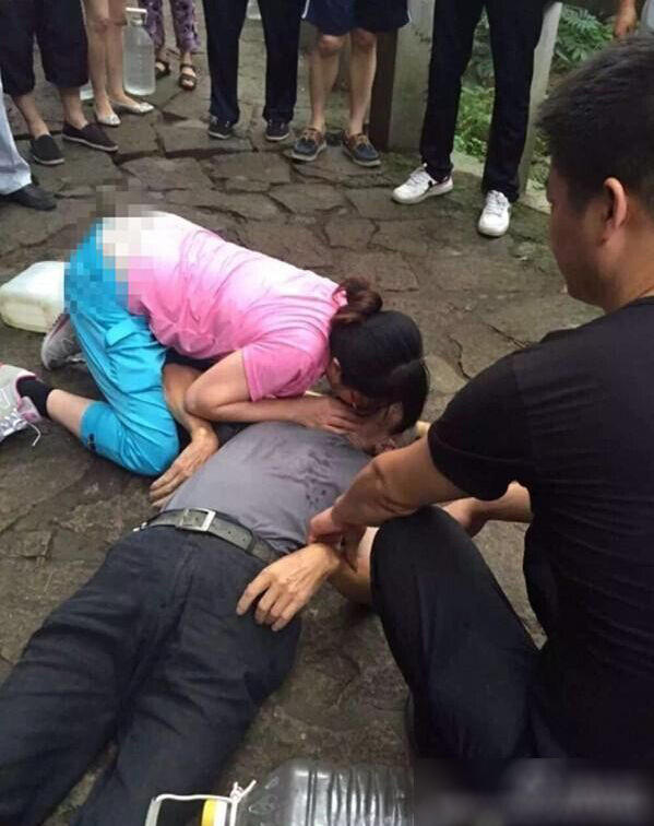 她赶紧蹲下,开始给老人做心肺复苏。一边给老人按压胸口,一边嘴对嘴给老人吹气。