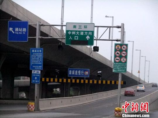 郑州市南三环一处上道口设置限高栏,防止高度超过2.5米以上车辆通行。 吴扬 摄