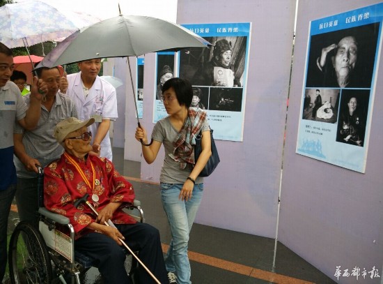 雨淅淅沥沥地下个不停,志愿者早早地来到了现场静候郑天付老人。而照片展示现场,已经围满了打着伞前来观看的市民。