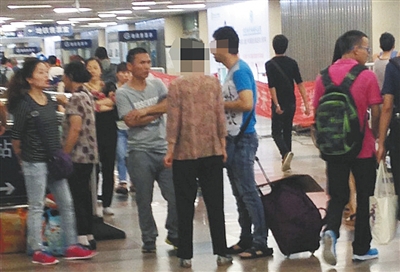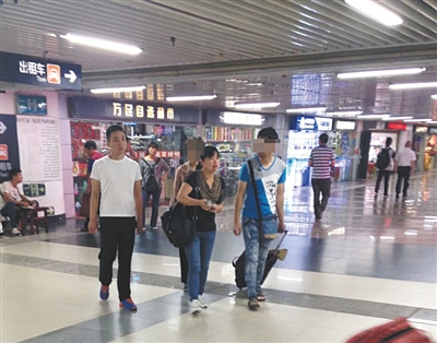 6月20日,北京西站,一男一女两医托(左一女子与灰衣男子)正忽悠母子俩去看专家。
