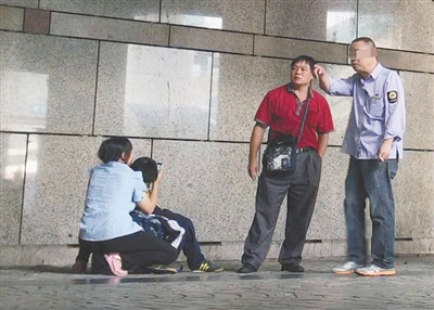7月4日,北京西站A1出口外,身着“公交集团制服”的医托与来京患者家属搭话。女家属蹲在地上,抱着生病的孩子。
