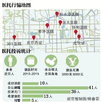 记者随机采访了近百位投诉者,发现他们均是来京就医的外地患者,受骗地点集中北京西站、北京站、积水潭医院、协和医院、阜外医院、301医院。受骗过程也几乎都可以概括为看病、医托介绍再高价拿药。