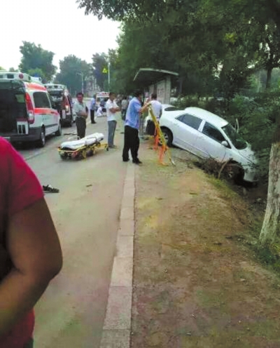 昨天下午,被撞坏的公交站护栏还未修好,有3米左右的护栏被完全撞倒,五六块公交站的站牌被撞断,现场有大量血迹。站台后的沟内散落着白色轿车的碎片和死者遗留的鞋帽、口罩等物品。两棵被白色轿车撞倒的树倒在沟里。一辆粉色自行车的前轮严重变形,被扔在路边。事发路段有十几米的刹车印,从道路外侧车道一直延伸到灰色轿车掉进的沟边,沟内也有明显的车辙印。