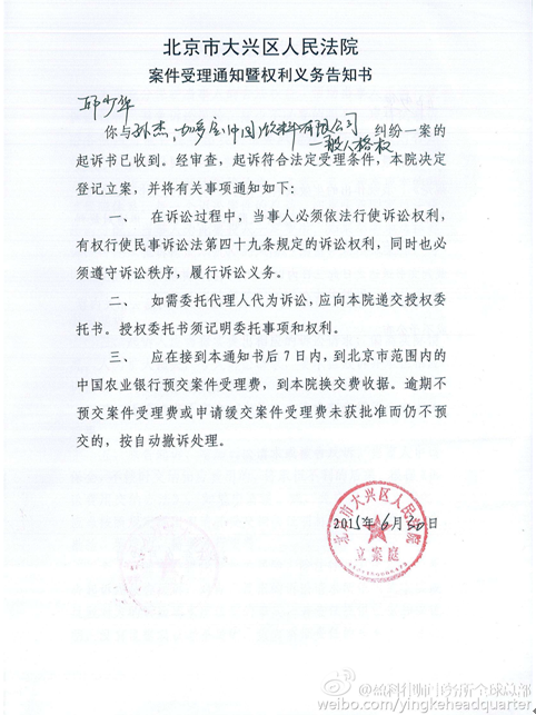 盈科律师事务所微博张贴出“北京市大兴区人民法院案件受理通知暨权利义务告知书”。