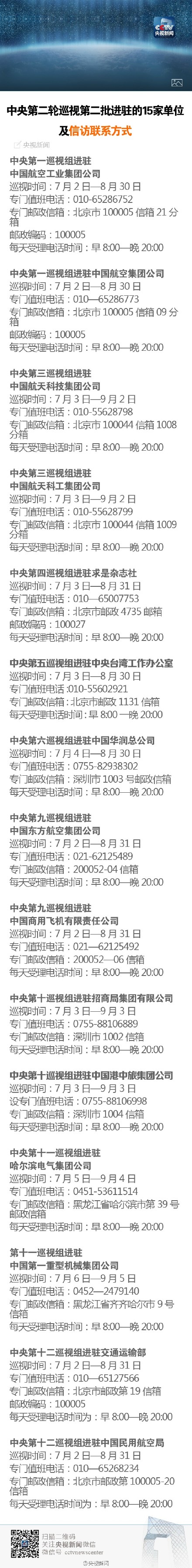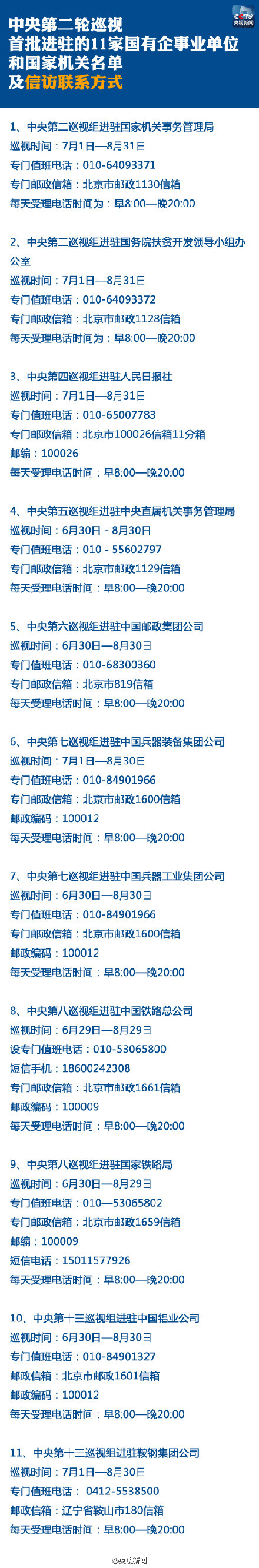 继上周进驻首批11家单位后,中央巡视组截至今天又集中进驻剩下的15家单位,并公布了信访联系方式,欢迎干部群众反映问题提供线索。至此,今年中央第二轮巡视13个巡视组已全部进驻完毕,将开展为期2个月的专项巡视。(记者李雪荣 宋琎)