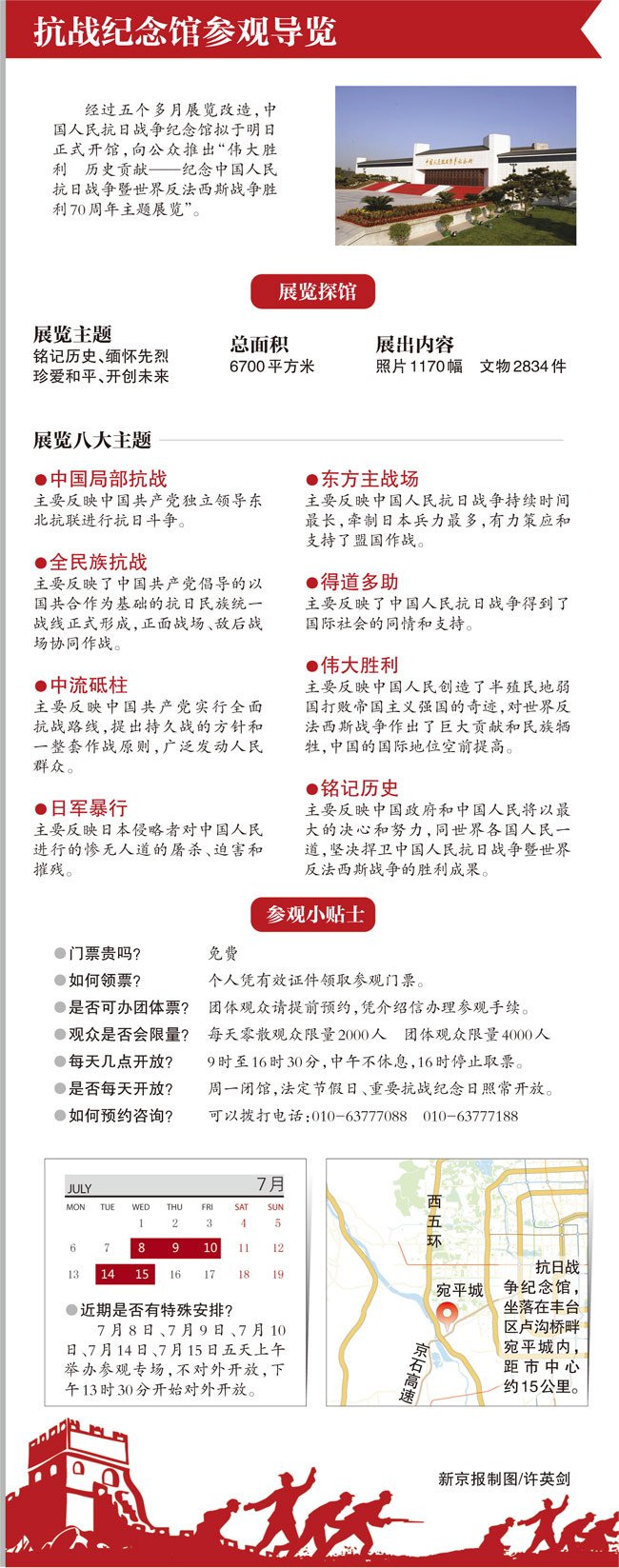 昨日,中国人民抗日战争纪念馆副馆长、新闻发言人李宗远介绍,主题展览以“铭记历史、缅怀先烈、珍爱和平、开创未来”为主体,总面积6700平方米,展出1170幅照片,2834件文物。