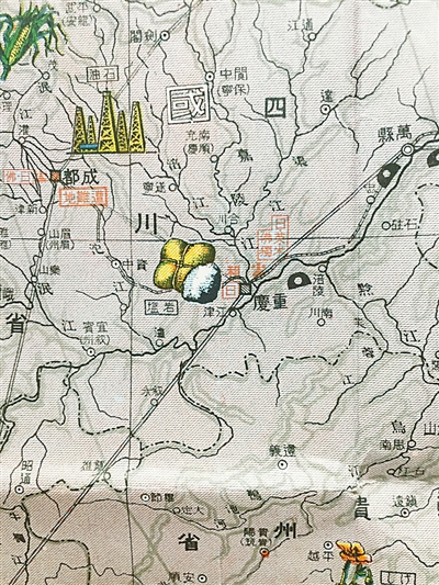 在北碚区档案局,记者看到了这张原版地图,地图色彩分明,还有各种小图标,比如盛产棉花的地区就用一个棉花图标标注,盛产矿产的地区就用装满煤炭的车标注。