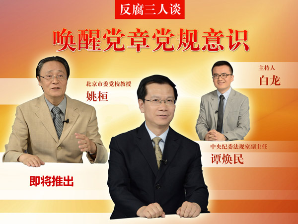 中央纪委监察部网站和客户端即将推出新一期“反腐三人谈”,中央纪委法规室副主任谭焕民,全国党建研究会特约研究员、北京市委党校姚桓教授和主持人白龙,将在节目中与您畅谈“唤醒党章党规意识”,敬请关注。