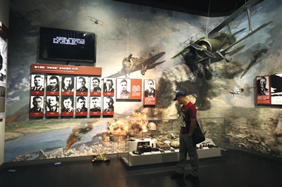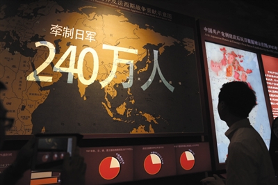 ●展厅中专门有一面墙,统计了中国战场在世界反法西斯战争中的贡献。通过世界地图展示中国人民抗战对世界反法西斯战争的贡献,投影变换展示抗击日军陆军兵力最高达94%,牵制日军240万。